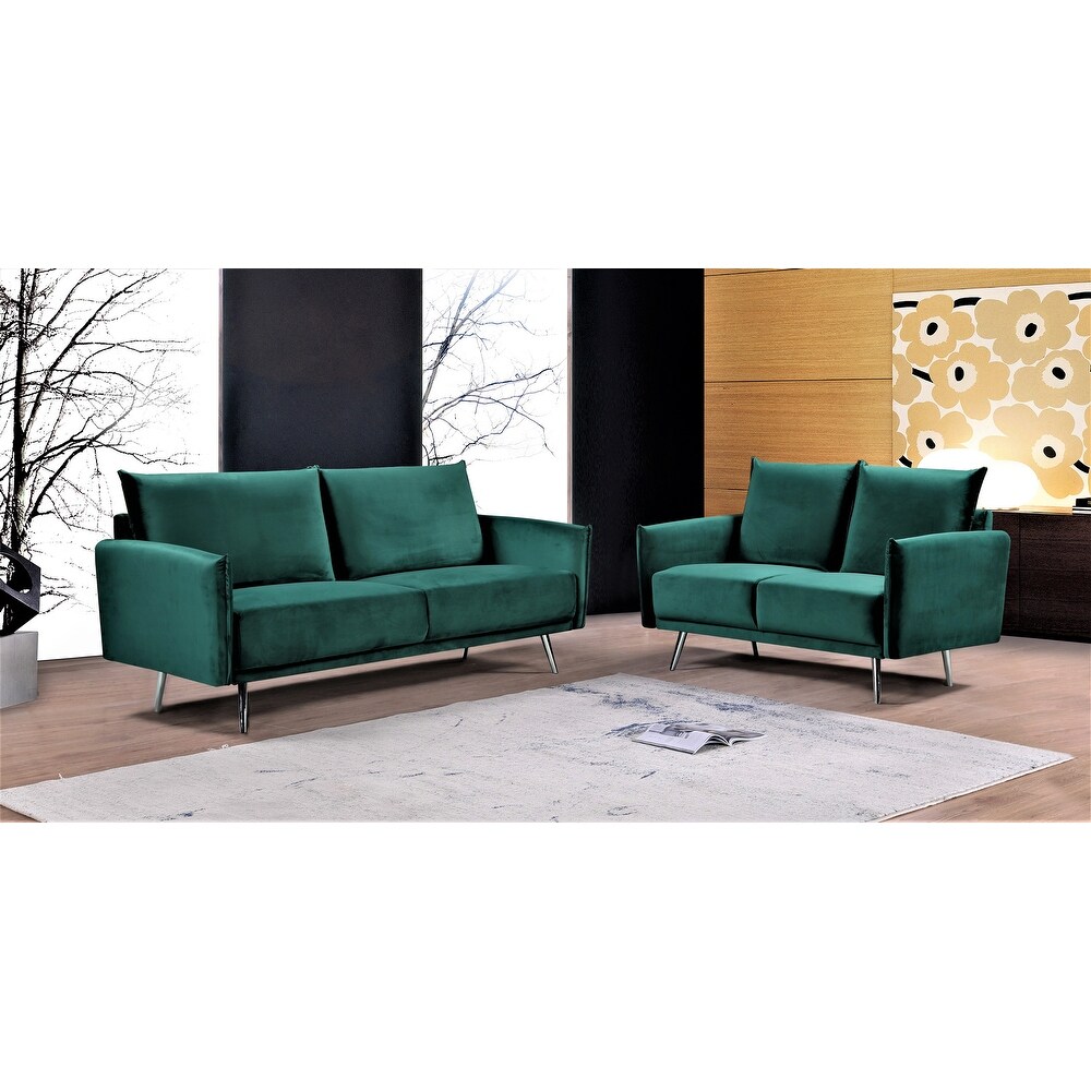 Beautifully styled and consciously crafted using materials, makes a welcome addition to any living space. velvet Fabric .upholstery imparts timeless style, while high-density foam creates luxuriously comfortable seating . boasts loose back cushions to showcase either details, set on sliver staineless Legs Complete your living room decor with these chic seating options. Our seats construction is coil spring, weight capacity can hold up to 500lb for sofa, 400lb for the loveseat.